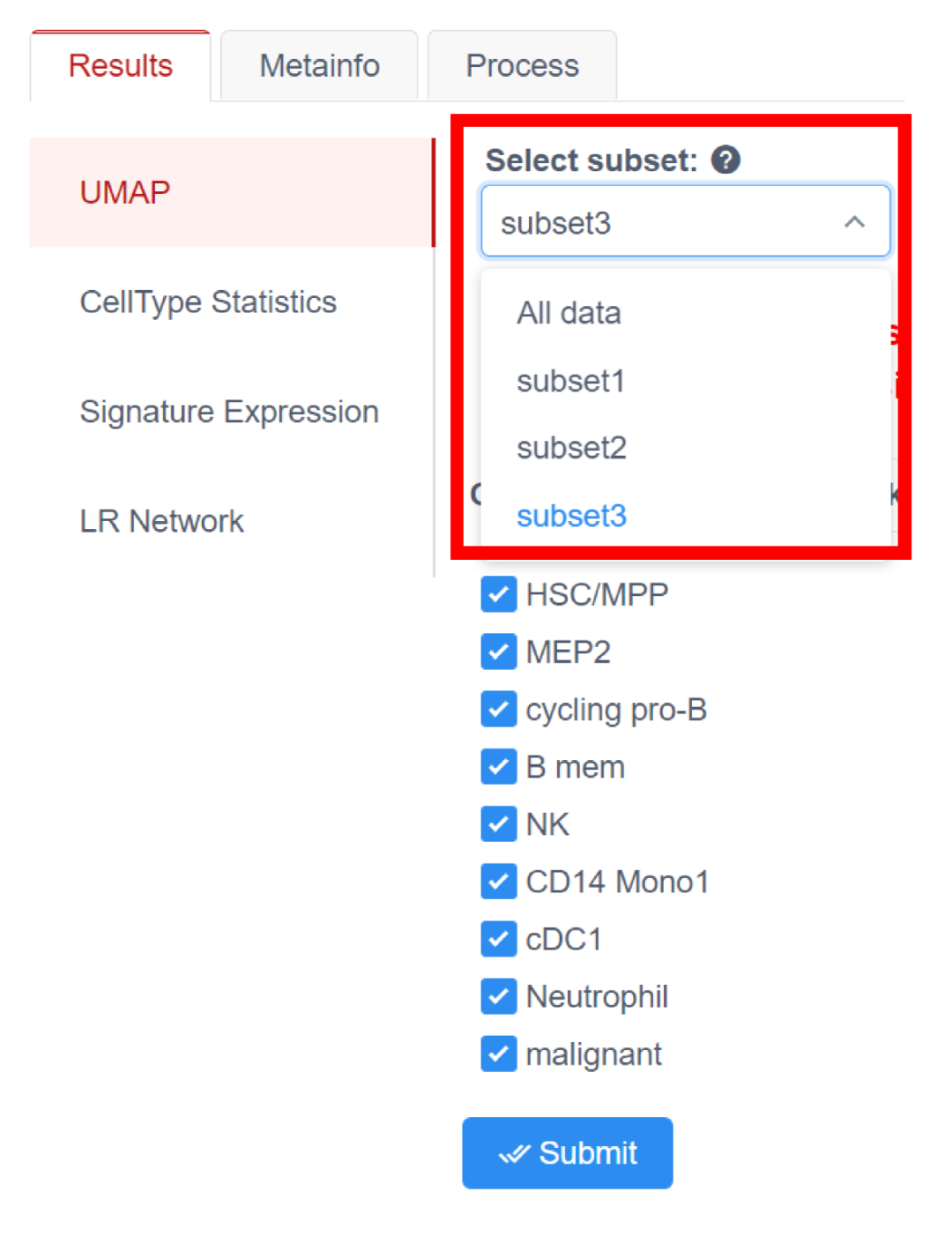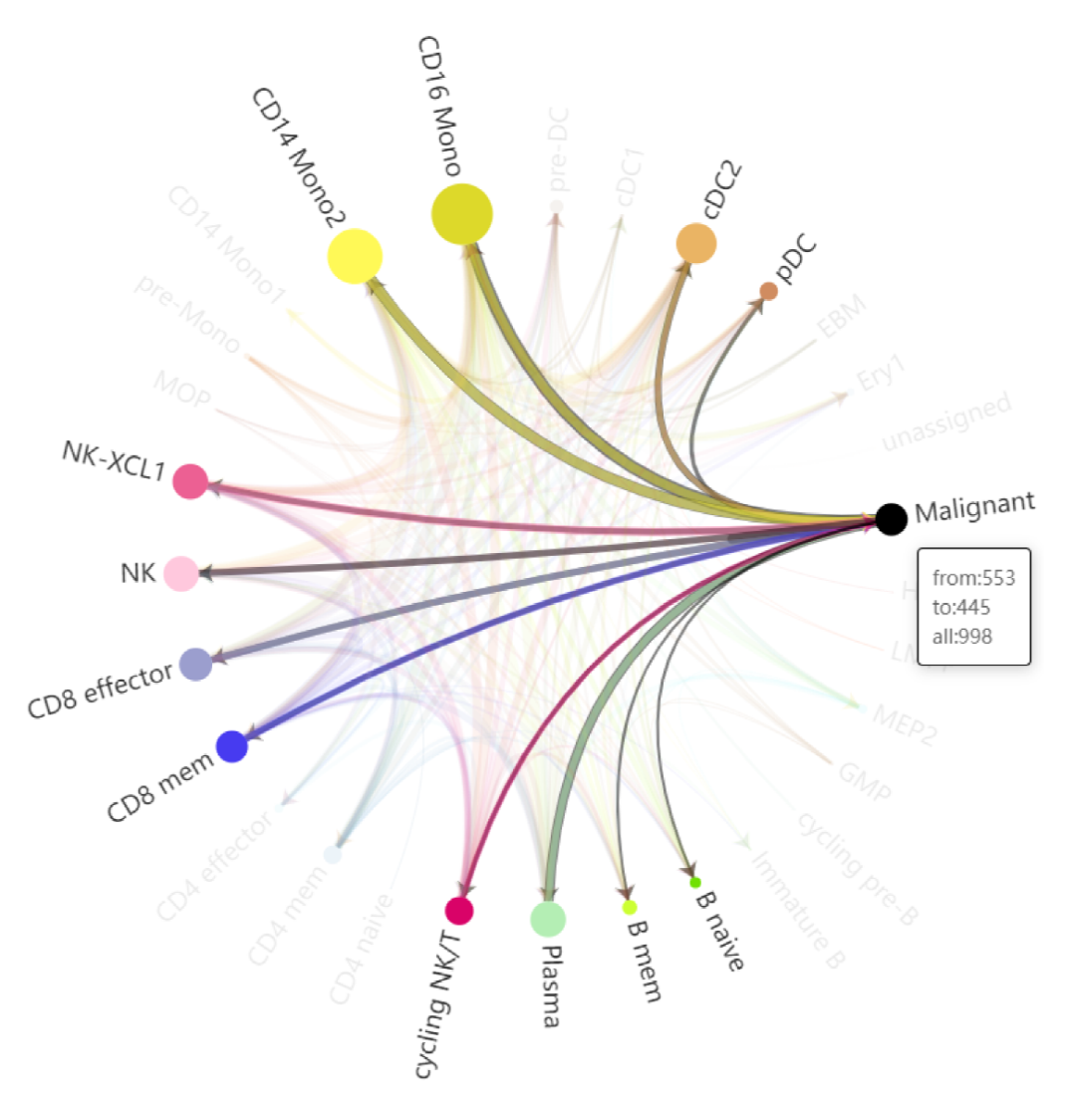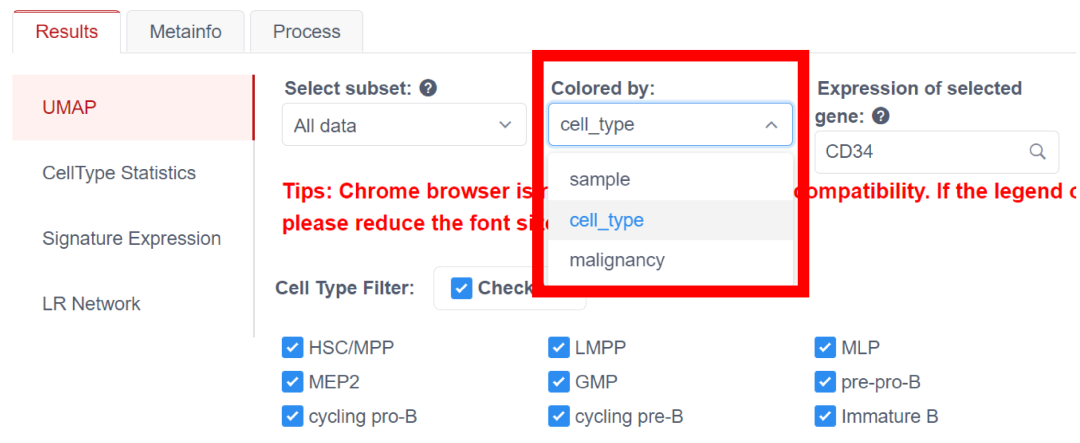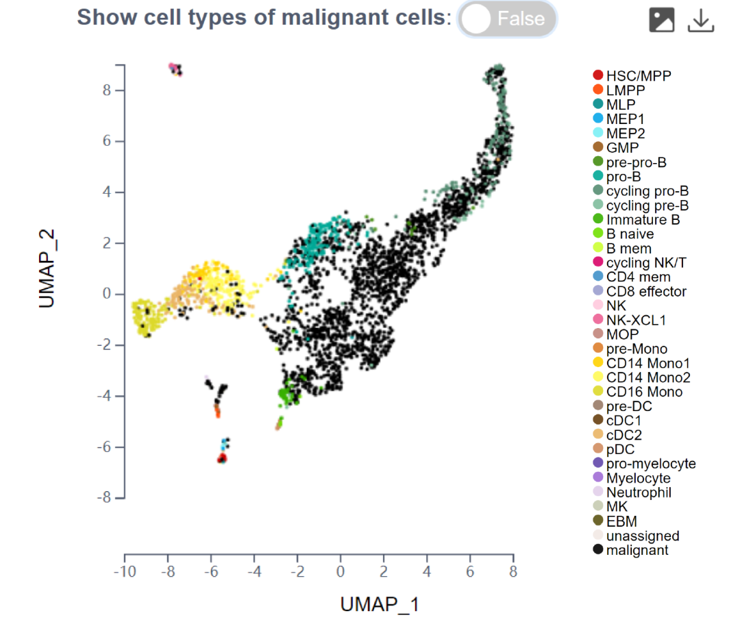 我们提供一个开关按钮,用于显示恶性细胞的可能细胞类型,方便用户探索恶性细胞的特征与异质性。