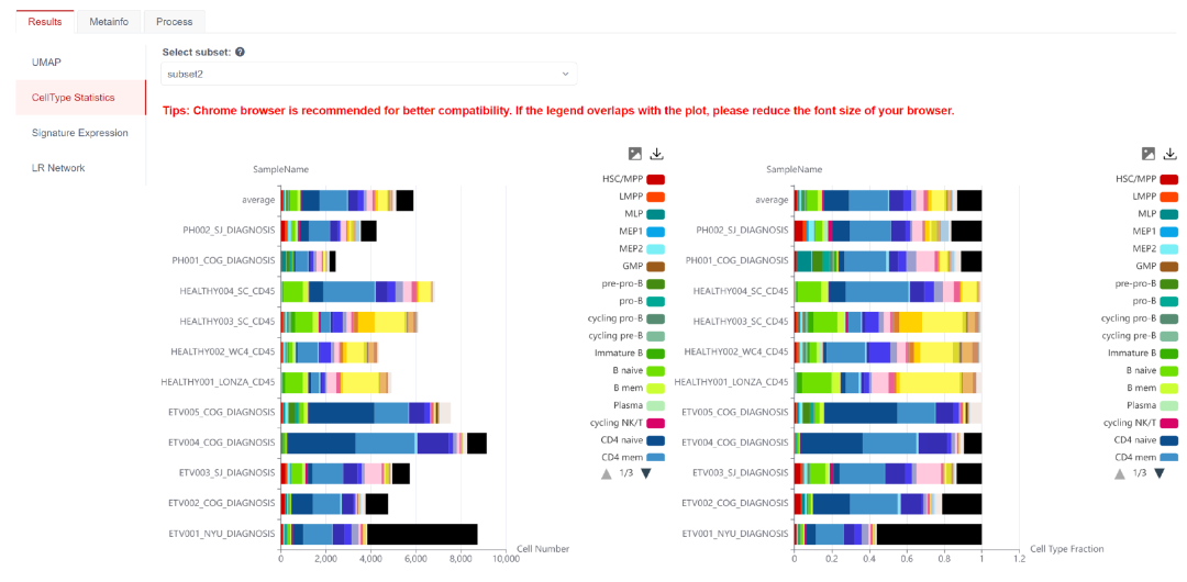 该模块显示每个样本或每位患者的细胞组成。可比较不同样本之间的细胞组成差异。