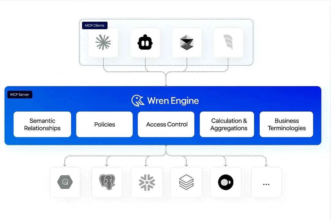 Wren AI 实现了一套语义引擎架构,让你可以在原始 schema 上建立一层"逻辑表示层"。说人话就是:你可以告诉系统"这个字段叫什么"、"这两张表怎么关联"、"这个指标怎么算",然后 LLM 就能理解你的业务上下文了。