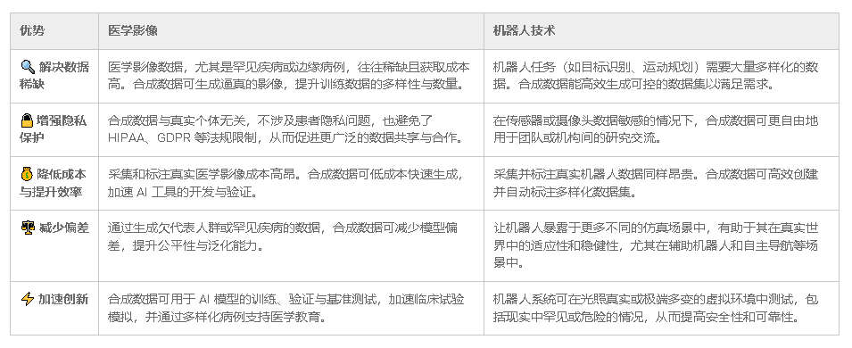合成数据生成(SDG)是医疗机器人开发的核心技术支撑。在医疗领域,真实患者数据的使用受伦理规范严格限制,且稀有病例数据难以获取,合成数据生成技术恰好破解了这一难题,具备多重显著优势:从隐私保护来看,可彻底规避真实患者数据的使用,杜绝隐私泄露风险;从训练场景覆盖来看,能够模拟稀有病例场景,为模型应对特殊情况提供充足训练数据;从模型鲁棒性提升来看,可通过受控的多样性设置,确保AI模型适配不同人群特征;从成本控制来看,无需开展昂贵的临床试验或繁琐的人工数据收集,大幅降低训练成本。
