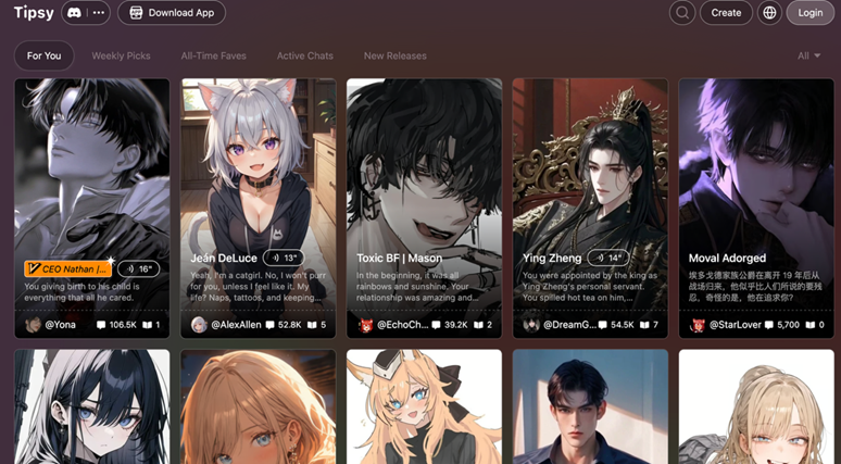 同样,Tipsy.chat也充分利用了.chat域名的优势。作为一个提供AI角色扮演聊天与视频互动的平台,Tipsy.chat主打“无滤镜”的沉浸式对话体验,用户可以与各种虚拟角色进行深度互动。.chat域名在这里的作用不仅仅是精准传达平台的核心功能,还强化了其在“AI+社交”领域的专业形象。