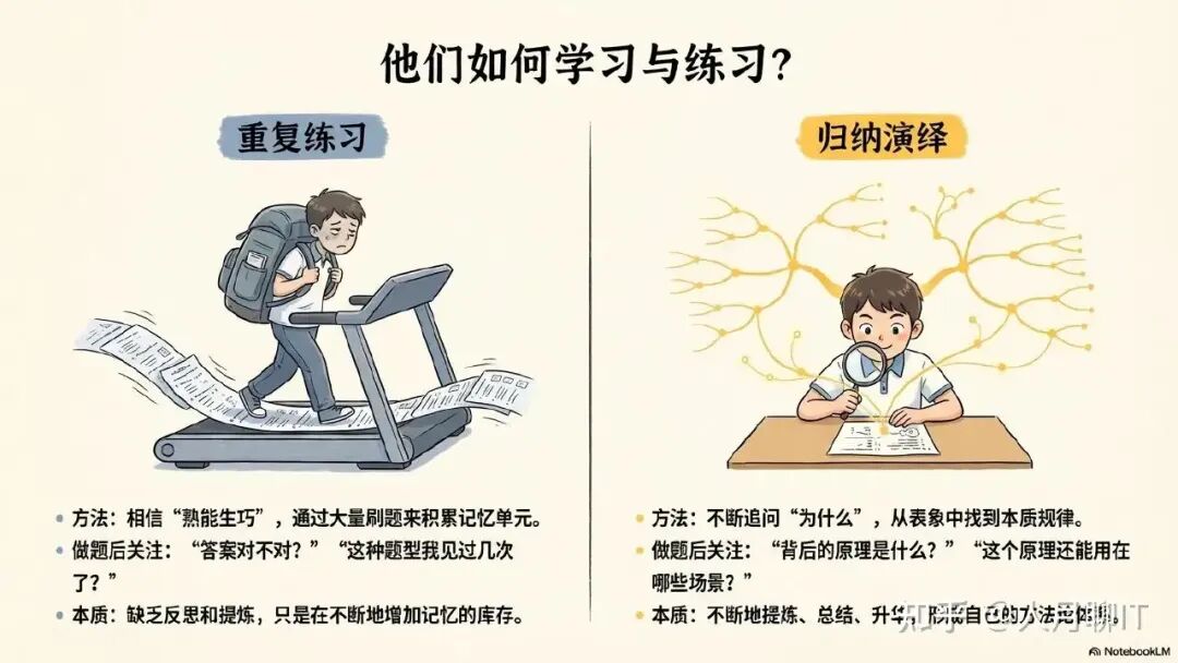 记忆型学习者的学习方式是重复练习。他们相信"熟能生巧",通过大量刷题来提高准确率。做完一道题后,他们关注的是:答案对不对?这种题型我见过几次了?还需要再做几道类似的题?他们的学习过程缺乏反思和提炼,只是在不断地积累记忆单元。