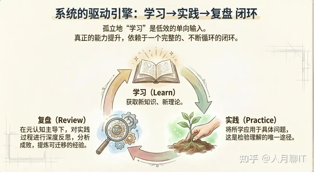 文档反复强调,孤立地”学习”知识是低效的。真正的能力提升依赖于一个完整的、不断循环的“学习→实践→复盘”闭环。