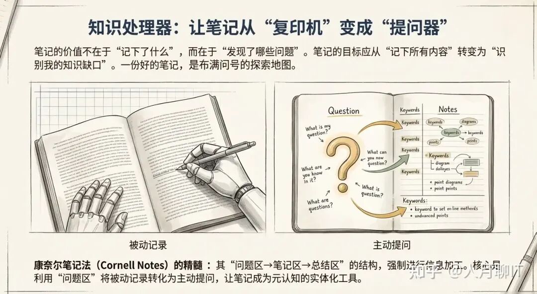 笔记成为元认知的实体化工具。通过记录问题,你实际上是在执行元认知的关键步骤——监控自己的理解状态(”我哪里没懂?”)。这直接服务于前文所述的”学习→实践→复盘”闭环中的”学习”与”复盘”阶段。