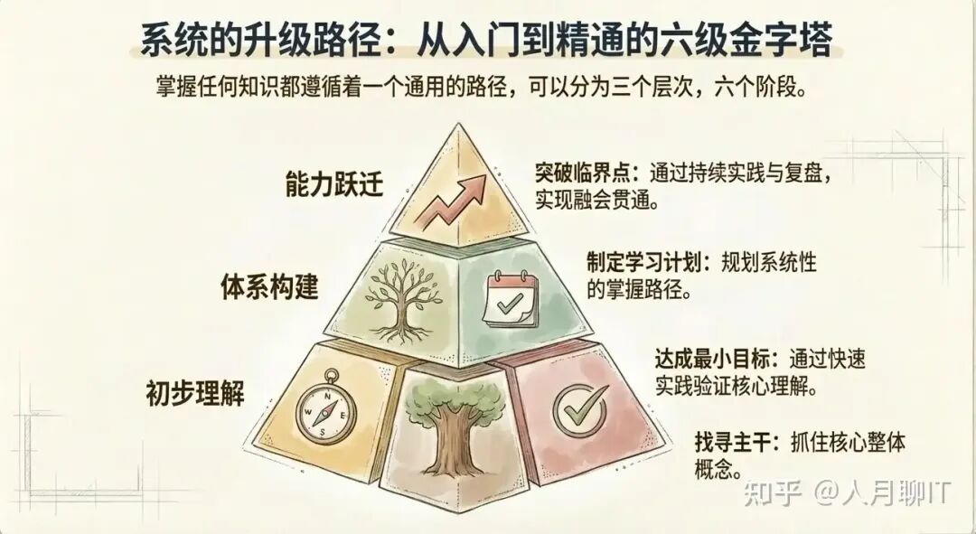 我把学习方法论重构为三层六阶段,兼顾广度、深度与突破。起步的不求甚解要求先总后分、黑盒视角把握全貌;找寻主干阶段用概念模型理清主路径;达成最小目标时设定可验证的小成果,快速形成第一波产出;构建完整知识树阶段补齐枝叶,形成全景知识结构;可视化迭代阶段把计划、指标与成果呈现出来;融会贯通阶段才是真正的质变,把方法与模式内化为能力。 每个阶段都要有真实产出与量化指标,增量堆砌无法替代迭代打磨。