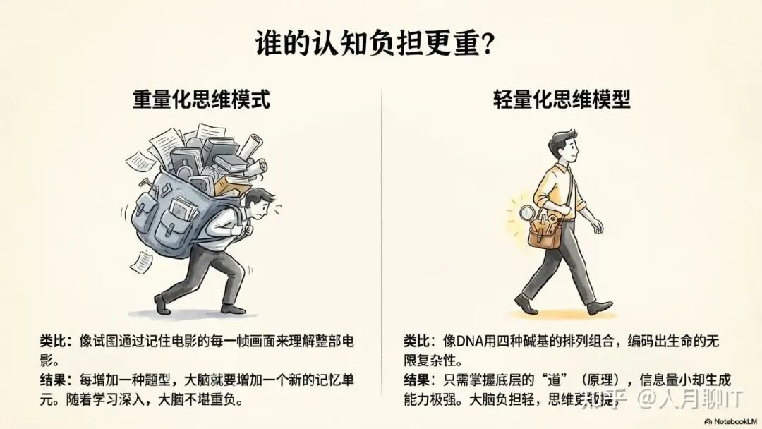 记忆型学习采用的是重量化思维模式。他们追求的是"术"——具体的技巧和答案。这要求大脑存储海量的具体信息。每增加一种题型,就要在大脑中增加一个新的记忆单元。这就像试图通过记住每一帧画面来理解一部电影,而不是理解电影的叙事逻辑。随着学习的深入,记忆型学习者的大脑负担会越来越重,直到不堪重负。