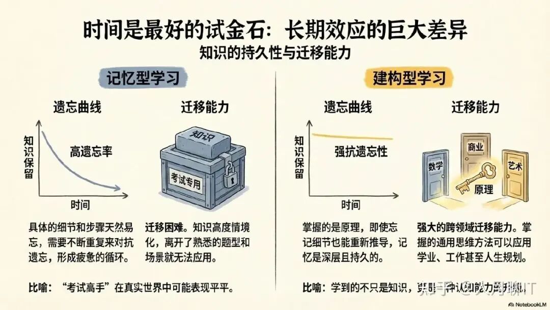 时间是检验学习效果的试金石。两种学习模式往往产生巨大的长期效应的差异。比如经过一个假期或一个学期,两种学习模式的学生往往会表现出截然不同的遗忘规律。建构型学习者展现出强抗遗忘性。因为他们掌握的是原理,而原理相对稳定。即使忘记了某个具体的公式或解题步骤,他们也能从底层原理重新推导出来。就像一个懂得编程原理的人,即使忘记了某个具体的语法,也能通过逻辑推理重新构建出来。这种基于理解的记忆,是深层的、持久的。记忆型学习者面临高遗忘率。因为他们存储的是具体的细节和步骤,而这些信息天然是易遗忘的。一旦遗忘了某个关键步骤,整道题就做不出来了。这就是为什么很多学生会感叹"一到假期,知识全还给老师了"。他们需要不断地重复练习来对抗遗忘,这形成了一个疲惫的循环。当学生走出校园,面对真实世界的复杂问题时,建构型学习者和记忆型学习者的差距会进一步拉大。知识的跨领域迁移能力