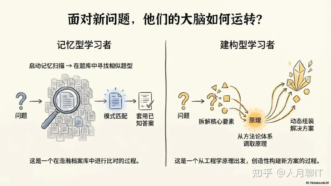 建构型学习与记忆型学习的差异,本质上是两种不同的认知操作系统。记忆型学习是"术"的层面,建构型学习是"道"的层面。