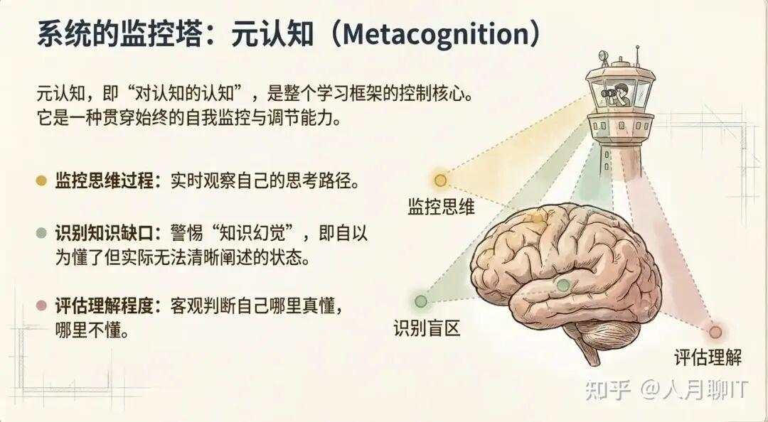 元认知,即”对认知的认知”,是整个框架的控制核心与最高优先级。它并非某种具体的学习技巧,而是一种贯穿始终的自我监控与调节能力。元认知的作用在于监控自己的思维过程、识别知识缺口、评估理解的真实程度。它能帮助学习者警惕”知识幻觉”——即自以为懂了,但实际无法清晰阐述或应用的状态。
