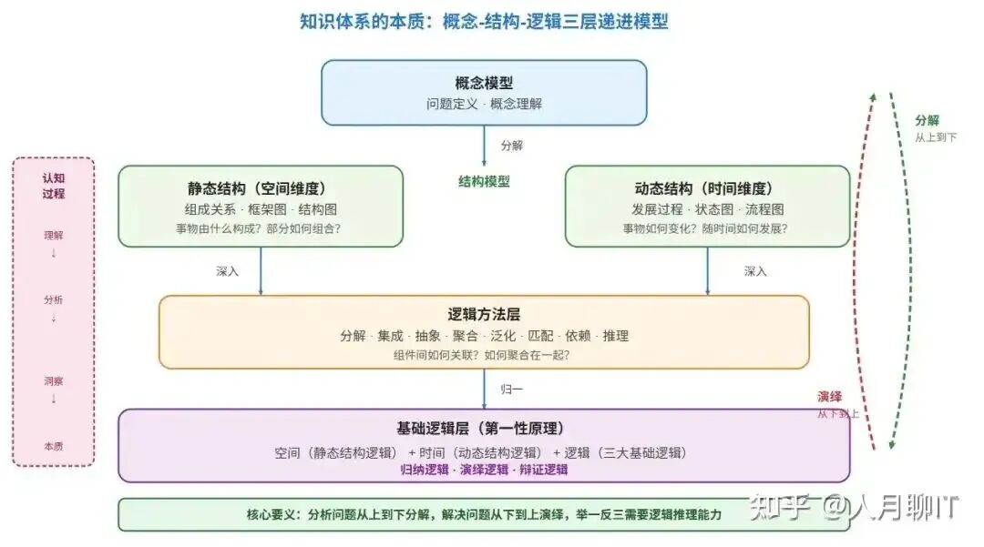 我一直把学习当成一套可建模、可复用、可进化的系统工程,把“事物认知+问题解决”作为双主线,把“学习—实践—复盘”作为闭环逻辑。通过需求、功能、逻辑、物理、行为五层分层设计,明确目标、能力、方法、工具和行为的一致性,让知识不再是孤立输入,而是能在内外循环里不断转化为经验与模式。