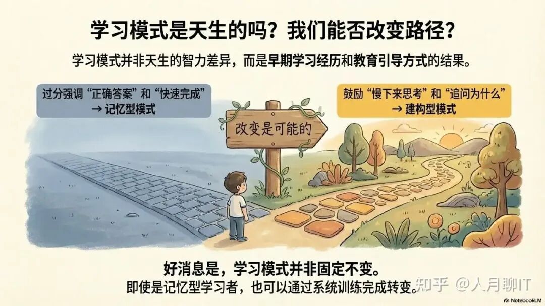 在孩子的学习早期,如果教育者(家长或老师)过分强调"正确答案"和"快速完成",孩子就会自然地形成记忆型学习模式。因为在这种导向下,最有效的策略就是记住尽可能多的题型和答案。相反,如果教育者鼓励孩子"慢下来思考"、"追问为什么"、"总结规律",孩子就更容易形成建构型学习模式。
