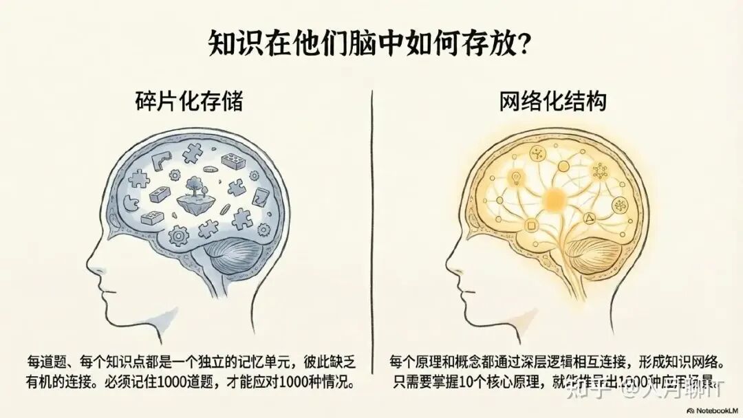 记忆型学习者的大脑中,知识以碎片化形态存储。每道题、每个知识点都是一个独立的记忆单元,彼此之间缺乏有机的连接。他们可能做过500道力学题,但每道题都是一个孤立的记忆片段。当遇到新题型时,如果记忆库中没有相似的案例,他们就会陷入无助。这种碎片化的知识结构,意味着他们必须记住1000道题,才能应对1000种情况。