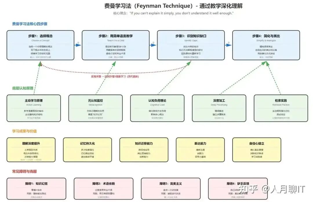 费曼学习法用四个递进步骤逼自己把概念讲明白。选择概念时从小而边界清晰的主题入手,明确是理解原理还是掌握方法;用简单语言教学迫使我抛弃术语、用类比拆解因果链,让逻辑保持可感知;识别知识缺口时,卡壳点就是元认知的镜子,标记、回溯、延伸阅读直到能顺畅讲出“为什么”;最后通过简化与类比,把冗余剔除、用故事化表达把知识图式固化下来。 它的底层依托主动学习、元认知监控和认知负荷控制。
