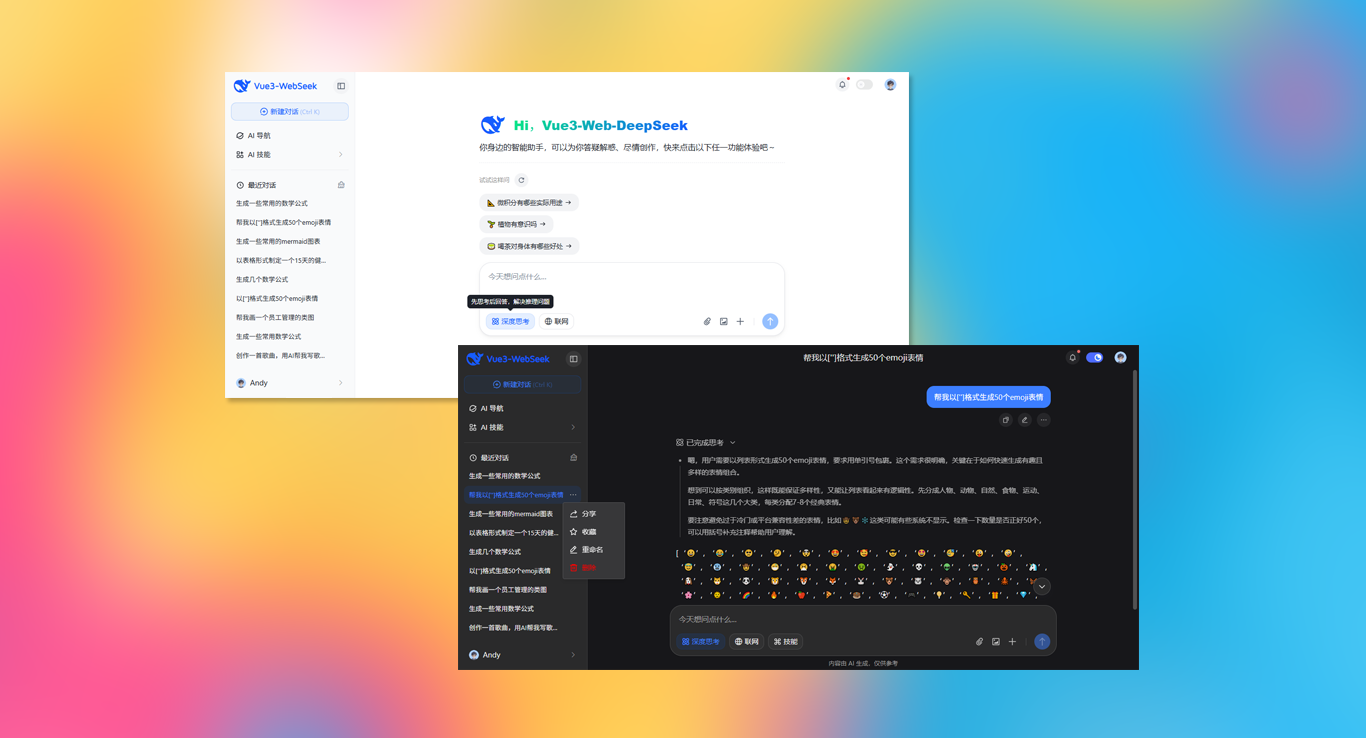 使用最新前端技术栈vite7.2+vue3.5搭建项目模板,接入deepseek-v3.2大模型。