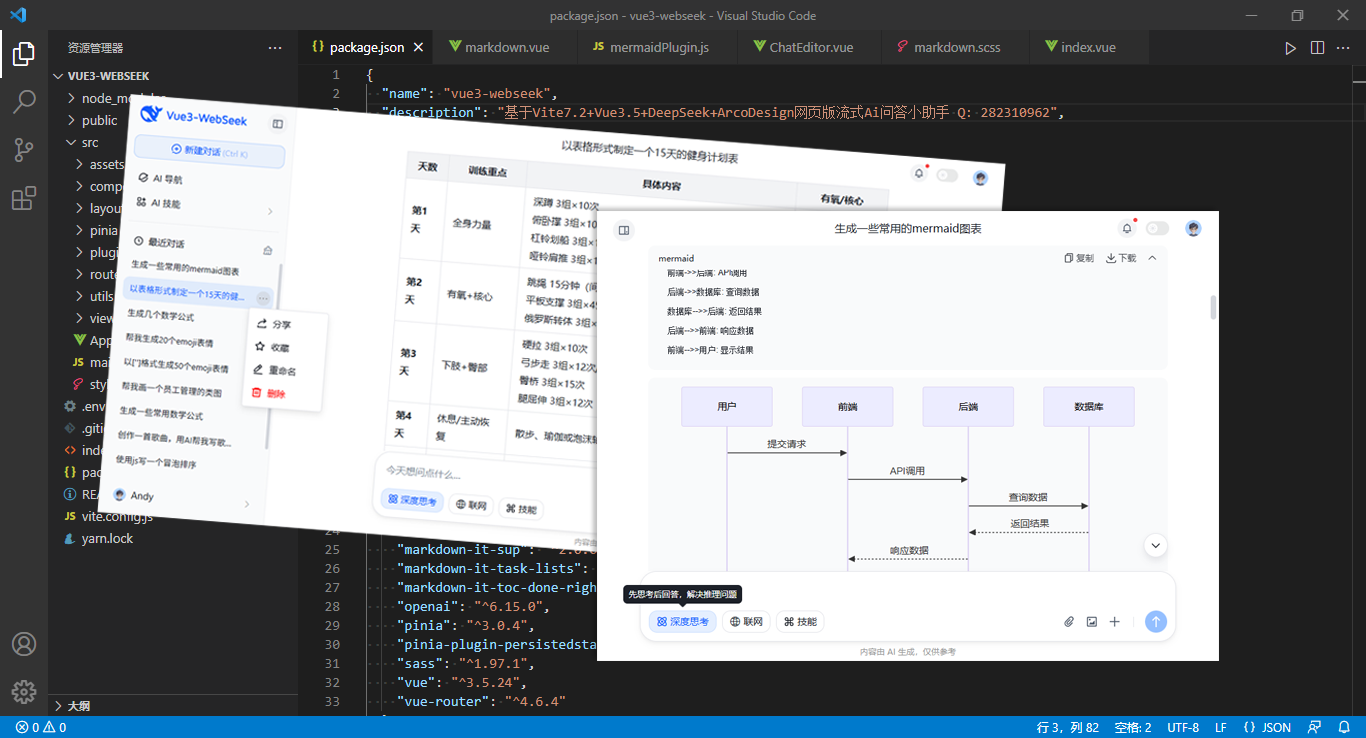 vue3-web-deepseek支持深度思考、各种代码高亮/复制、latex数学公式和mermaid图表功能。