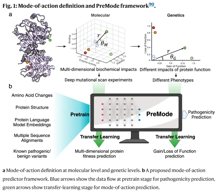 精确预测错义变异的功能影响对于疾病基因发现、临床基因诊断、治疗策略制定以及蛋白质工程至关重要。以往研究多集中于预测二分类的致病性,但错义变异的功能影响是多维的。同一基因的致病性错义变异可能通过不同作用机制(如功能获得或功能丧失)影响蛋白质功能,并导致截然不同的临床表现,需要差异化的治疗方案。研究人员开发了一种新方法——PreMode,用于进行基因特异的作用机制预测。PreMode 基于蛋白质序列和结构,利用 SE(3) 等变图神经网络建模编码序列变异的影响。在目前规模最大的带有作用机制标签的错义变异数据集上,PreMode 通过高效的迁移学习,在多种作用机制预测任务中达到了最新的性能。此外,PreMode 在预测激酶中的功能获得/丧失变异时,与其失活–激活构象转变的能量变化相一致。研究人员还展示了 PreMode 在深度突变扫描研究设计中的实用性,并证明其可通过主动学习扩展至非人源蛋白质的适应性优化。