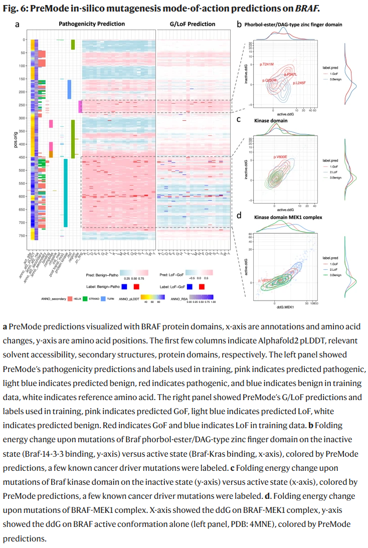 PreMode 在 BRAF、TP53、RET、KCNJ11、PTEN 等基因中绘制了全变异的作用机制预测景观,并结合结构建模与折叠能计算揭示了不同区域的 GoF 与 LoF 机制。例如,BRAF 激酶结构的 GoF 变异倾向破坏失活构象并稳定活化构象;PTEN 中部分变异仅影响酶活性而不影响稳定性,可能具有显性负效应。