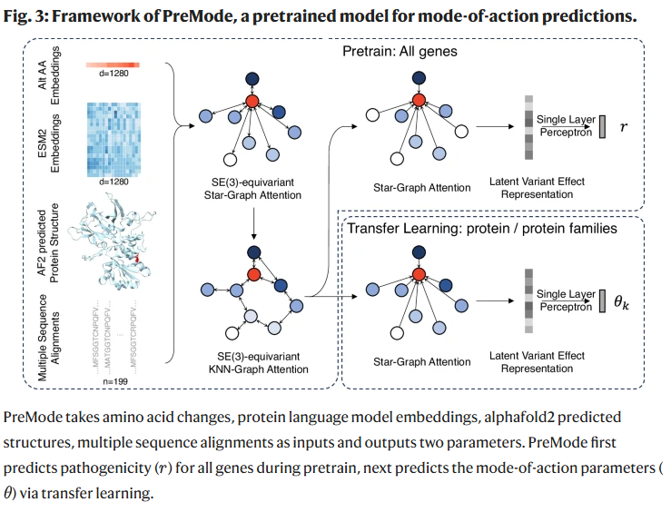PreMode 输入包括氨基酸生化特性、蛋白质上下文和跨物种保守性信息,结合蛋白语言模型嵌入(ESM2)与 AlphaFold2 预测结构,并采用 SE(3) 等变图注意力机制同时建模主链与侧链几何信息。预训练阶段基于大规模致病性数据,迁移学习阶段在特定基因的 GoF/LoF 或多维 DMS 数据上优化。