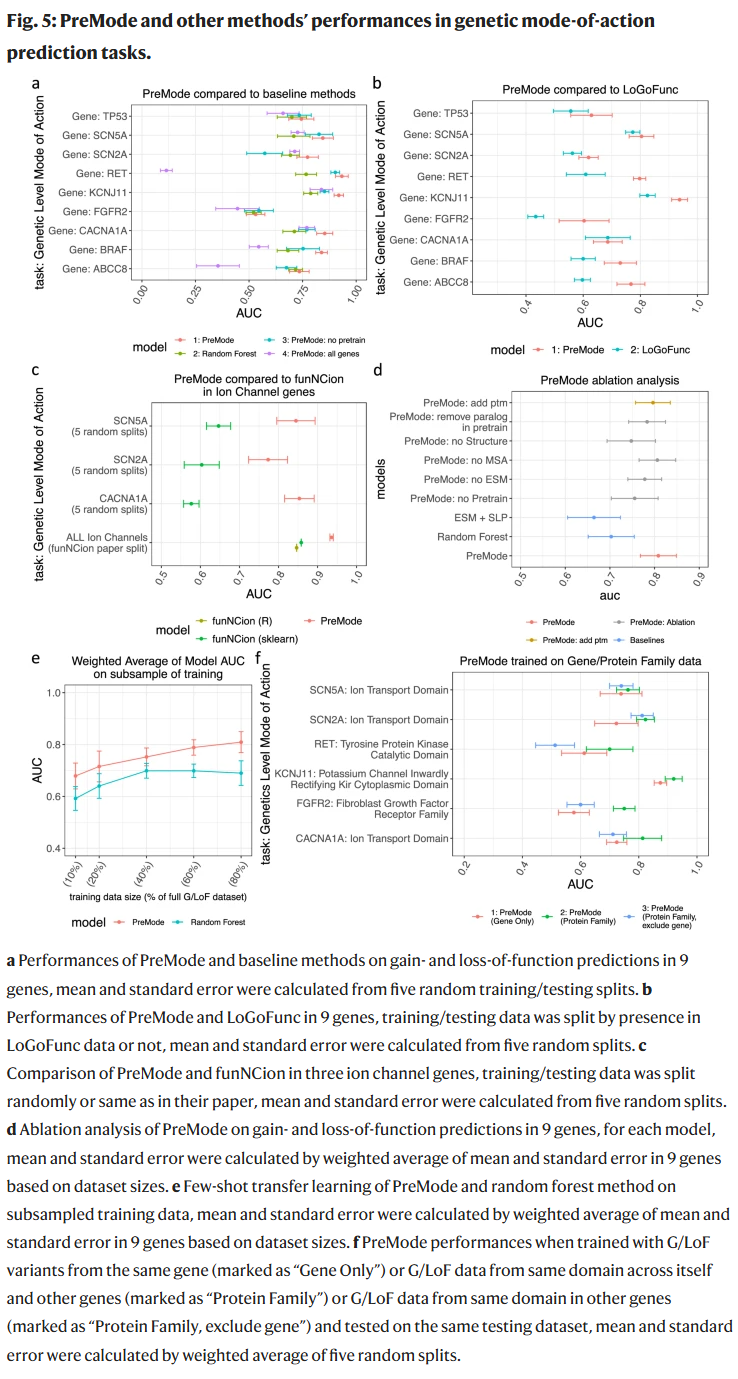 在 9 个 GoF/LoF 变异数量充足的基因上,PreMode 的基因特异迁移学习性能优于所有基线方法(AUC 多数在 0.8–0.9 之间)。研究人员还发现,利用同一功能域的跨基因数据可提升小样本基因的预测性能。
