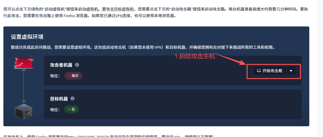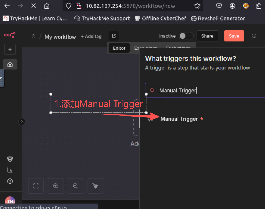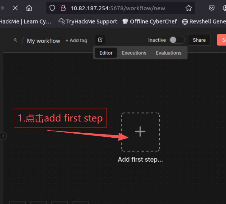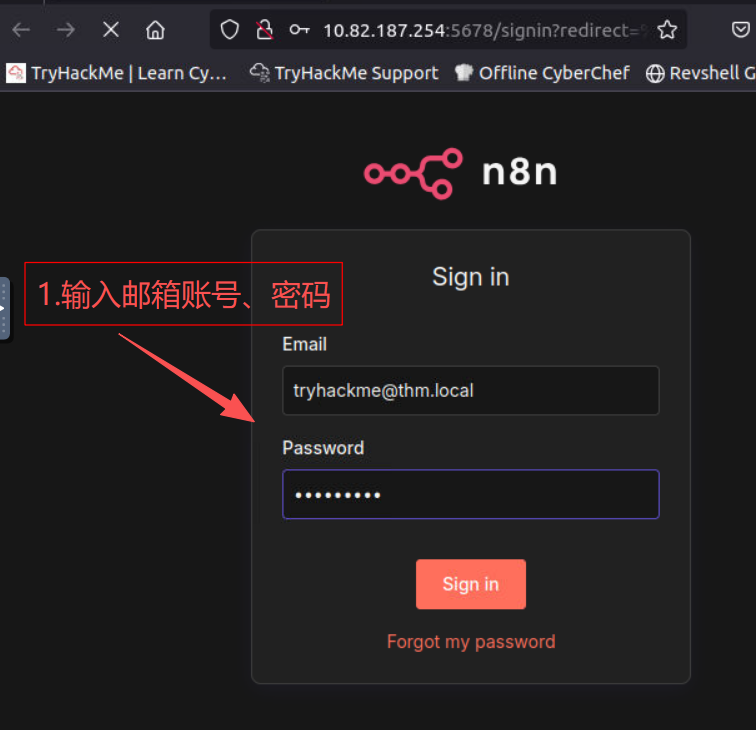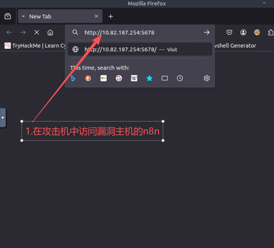 4.在攻击机中的火狐浏览器中输入漏洞主机n8n地址:http://10.82.187.254:5678访问漏洞主机的n8n服务