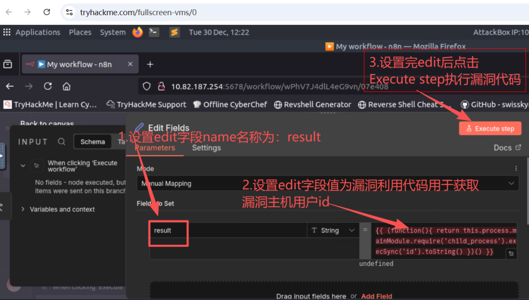 11.设置edit字段的名称为name,value中输入漏洞利用代码,该漏洞利用代码用于获取当前主机的id,设置完后点击Execute step执行漏洞利用代码