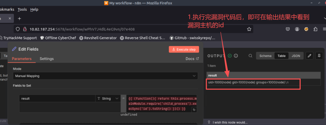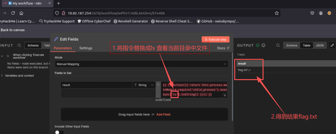14.将ls替换成cat flag.txt,用于获取flag.txt文件内容,点击Execute step执行后,可在output中查看到flag.txt的内容"THM{n8n_exposed_workflow}"