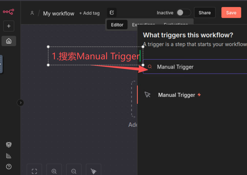 10.点击Manual Trigger,搜索Edit Fields(Set),并添加Edit Fields(Set)