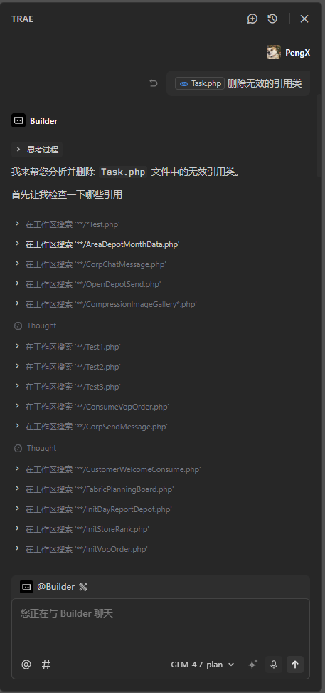 Task.php 文件作为上下文传给 GLM-4.7,模型能完整分析类依赖。不要被“模型名称”迷惑
