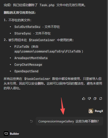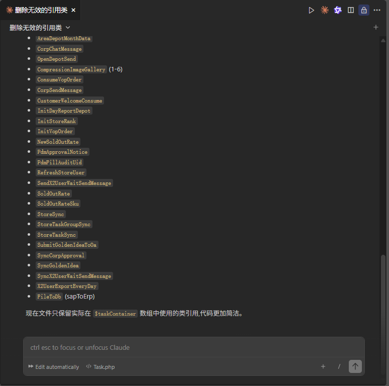 在 Trae 中粘贴 Task.php 并输入上述提示后,它只删除了部分未使用的 use 语句。