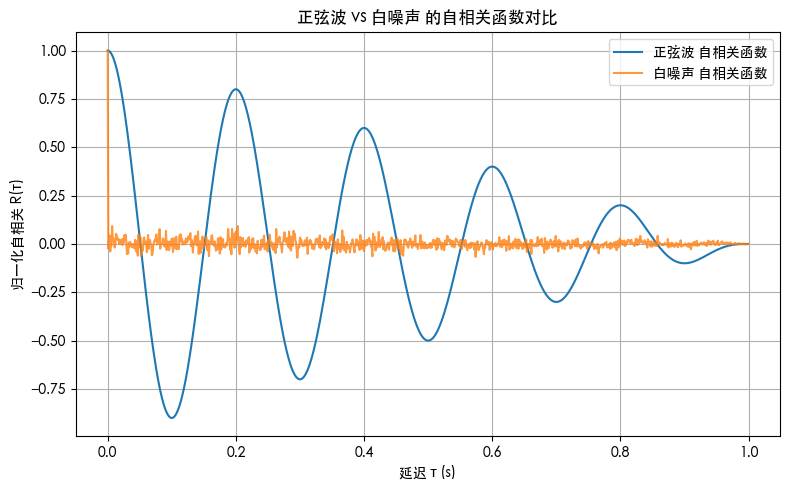 自相关函数 描述信号与自身延迟后的相似程度:在时域上揭示信号的平稳性、周期性和随机性;在频域上通过傅里叶变换对应功率谱密度(PSD)。
