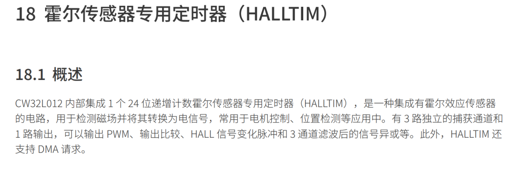 这个 **24 位递增计数霍尔传感器专用定时器(HALLTIM)**,专为电机霍尔信号测量与换向设计,可对三路霍尔信号进行捕获、滤波、异或组合、以及产生触发输出与 PWM 信号。