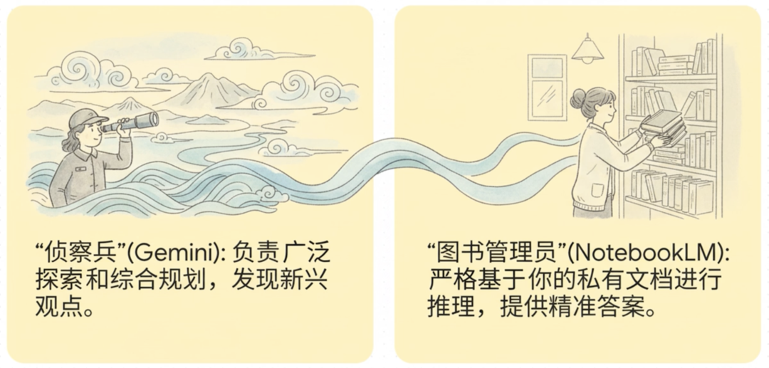 作为一名从业者,我使用 AI 的心得是:最高效的 AI 用法在于理解其特点,并充分发挥其长处。谷歌的 Gemini 和 NotebookLM 组合清晰地展示了这一点,我们姑且概括为“侦察兵”与“图书管理员”的组合。