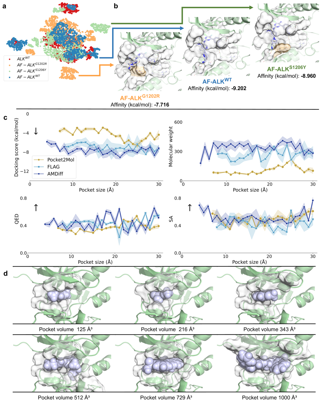 面对蛋白突变,AMDiff适应性强。以ALK蛋白突变为例,生成的针对不同突变体的分子在化学空间分布有重叠也有差异,能根据突变产生差异化结构。在不同尺度的ALK口袋中,AMDiff均能成功生成可行分子,而部分基线模型在小口袋中存在局限。如下图: