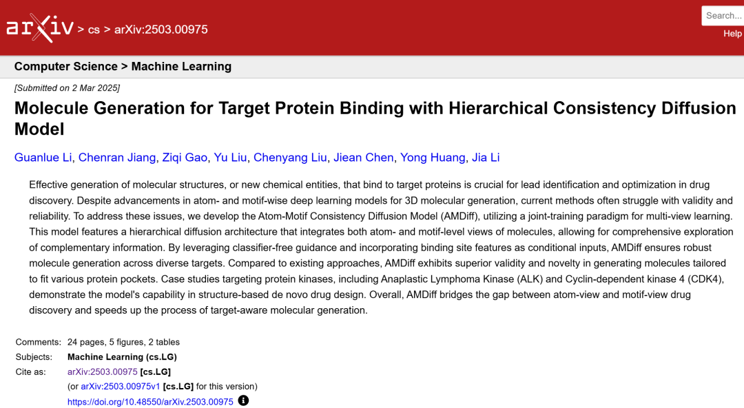 近日发表于arXiv的研究论文《Molecule Generation for Target Protein Binding with Hierarchical Consistency Diffusion Model》提出了一种创新的分子生成模型。研究团队由Guanlue Li、Chenran Jiang等学者组成,来自香港科技大学、深圳湾实验室等机构。他们开发的原子-基序一致性扩散模型(AMDiff),利用联合训练范式和分层扩散架构,在生成与目标蛋白结合的分子方面取得了显著进展,为药物设计带来了新的突破。