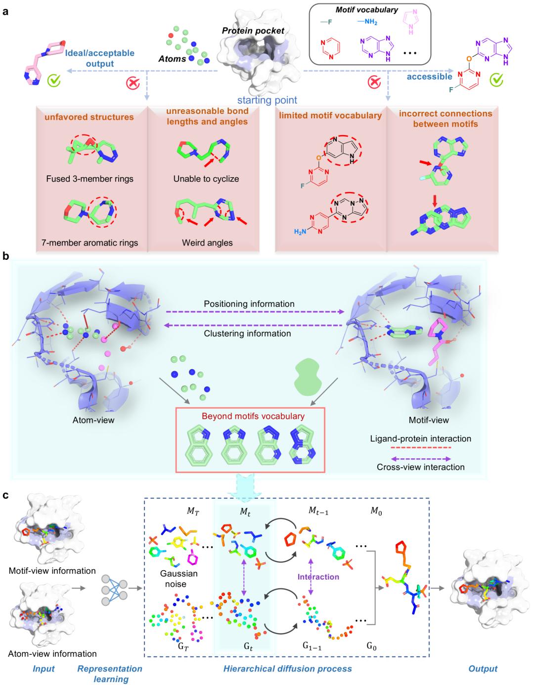 在药物研发的征程中,精准设计能与目标蛋白紧密结合的分子结构,即新化学实体,对先导化合物的发现和优化至关重要。近年来,AI在制药领域成绩斐然,像AlphaFold革新了蛋白质结构预测,为药物设计提供了更精准的蛋白结构。但药物分子的化学空间极为广阔,传统虚拟筛选方法效率低、成本高且局限于已知结构,开发新型AI工具进行端到端的基于结构的药物发现迫在眉睫。当前,基于原子或基序的深度学习模型在3D分子生成方面虽有进展,但原子级方法常出现键长、键角不合理的问题,导致分子结构怪异;基序级方法依赖预定义库,限制了对未知化学空间的探索,难以生成新颖结构。