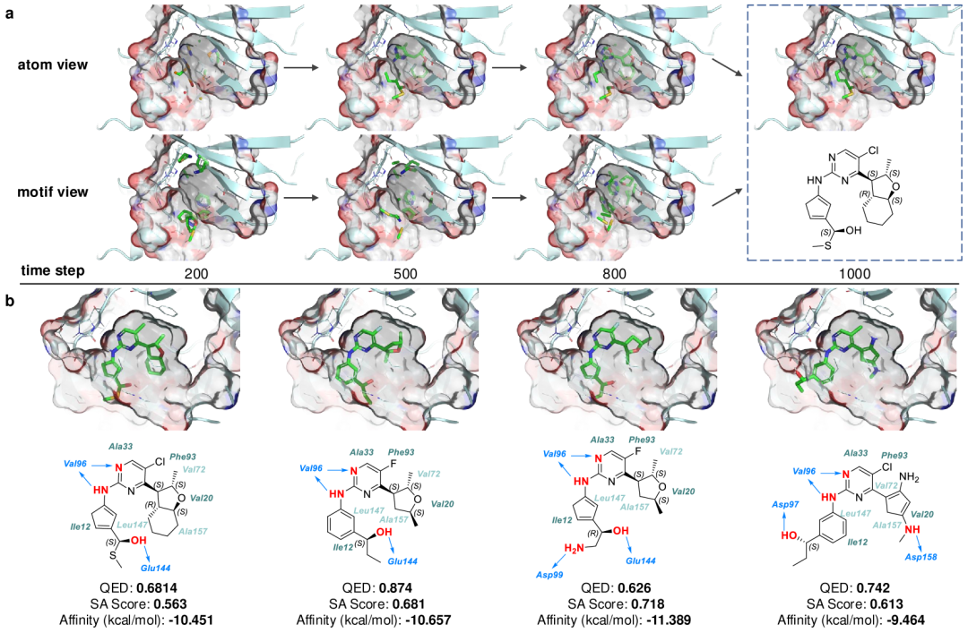 上图聚焦AMDiff针对CDK4靶点生成分子的情况,有力验证了模型在实际药物设计中的有效性。