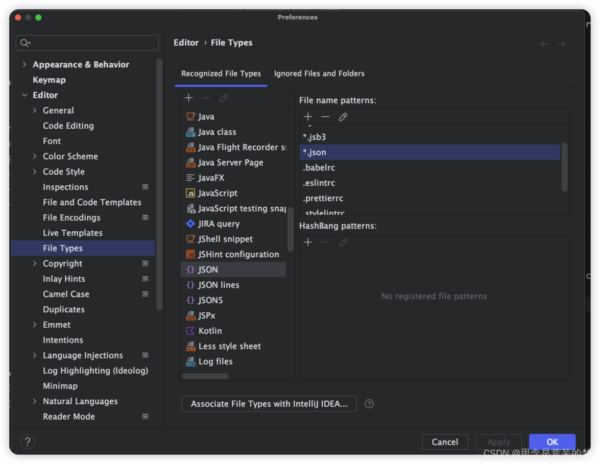 解决办法 :在idea中 打开设置 ,找到 Edit->File Types->在右侧找到json->点击加号 加入*.json 保存即可
