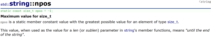 string (const string& str, size_t pos, size_t len = npos);npos 是一个缺省参数,表示最后一个字符。查看 npos 的定义,可以看到它是一个静态成员,表面值是 -1,实际是极大值。