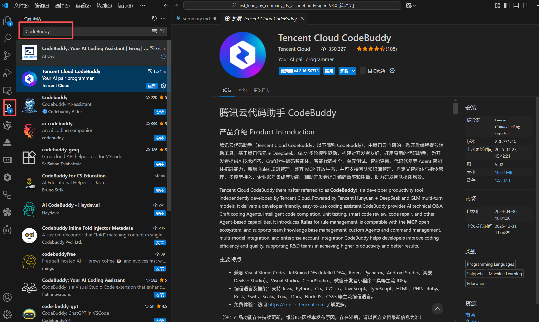我试着在VS Code中安装部署好codebuddy的插件,这个过程很简单,当时随便在插件中一搜就有了。