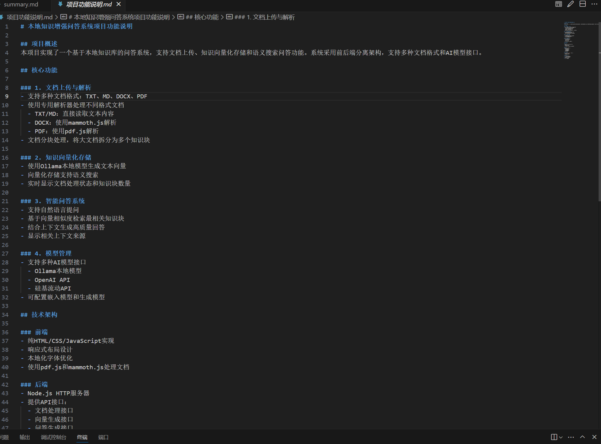 实现了一个基于本地知识库的问答系统,支持文档上传、知识向量化存储和语义搜索问答功能。系统采用前后端分离架构,支持多种文档格式和AI模型接口。