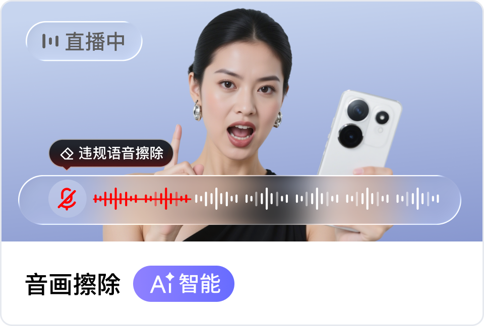音画擦除:全自动、精准化的内容合规利器。内容安全是直播的生命线。“音画擦除”是我们直播审核能力的重磅升级。它不仅能识别违规内容,更能对识别出的违规音频进行实时智能消音处理,对违规画面、Logo等进行擦除。通过与自定义违规词库联动,实现从识别到处理的全流程自动化风控,在保障平台合规的同时,极大减轻人工审核压力,确保直播环境清朗。