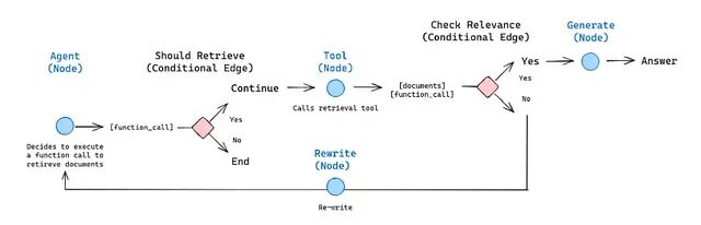 重写函数处理那些被评分环节打回来的查询。它会让 LLM 把原始问题改写成检索友好的形式,用词更精准、关键信息更突出。改写后的查询再交回智能体重新发起检索。