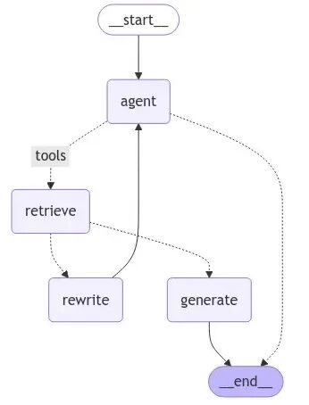 接线逻辑如下:查询先到智能体节点,智能体决定调检索器的话流程就到检索节点,检索完进评分,评分过了走生成,没过走重写,重写完的查询再回智能体重新来过。生成节点执行完流程结束。