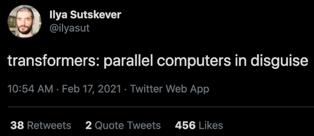 这里我引用一下 Ilya Sutskever 的一句话:“Transformers: parallel computers in disguise”,直白的意思是:Transformer 本质上是一个被神经网络外壳包裹起来的并行计算机。这也是 Transformer 最先能够显现智能的核心原因,因为它的并行计算特性完美匹配了 GPU 的并行计算单元。