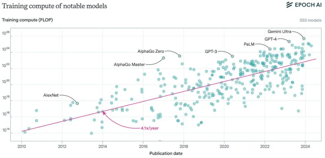 前沿规模机器学习模型训练所用计算量的趋势,图源:Epoch AI