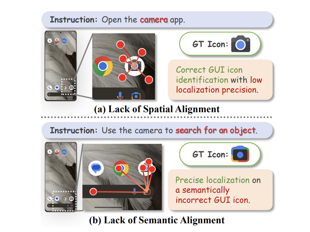 GUI Grounding 的主要失败模式: (a) 空间对齐失败,(b) 语义对齐失败