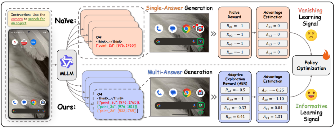 1. 多答案生成机制(Multi-Answer Generation) 传统的 RL 方法通常只采样一个动作,一旦模型 “固执己见” 地选错,梯度的学习信号就会消失。AEPO 强制模型在一次前向传递中生成 N 个候选坐标点。这一机制迫使模型跳出单一的高置信度预测,去探索策略分布长尾中的可能性,从而大幅增加了发现正确答案(如上述例子中的 Google Lens)的概率。