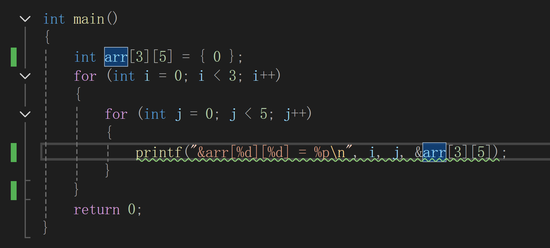 从输出的结果来看,每⼀⾏内部的每个元素都是相邻的,地址之间相差4个字节,跨⾏位置处的两个元素(如:arr[0][4]和arr[1][0])之间也是差4个字节,所以⼆维数组中的每个元素都是连续存放的。