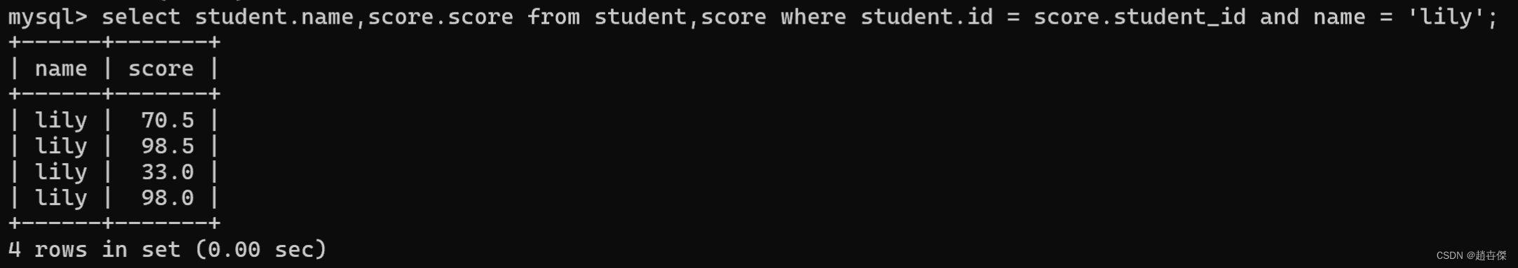 select name,score from student join score on student. id = score.student_id and student. name = 'lily';查询所有同学的总成绩及个人信息
