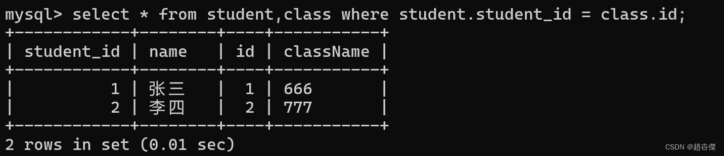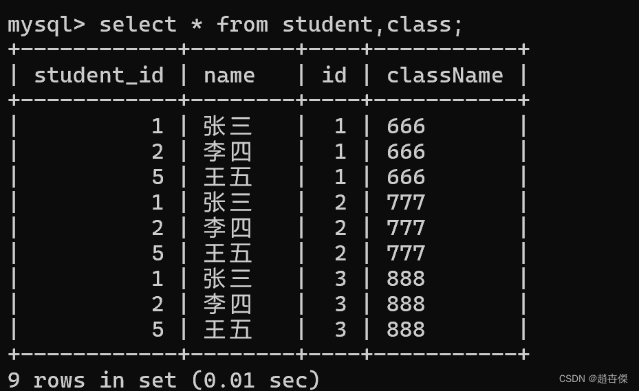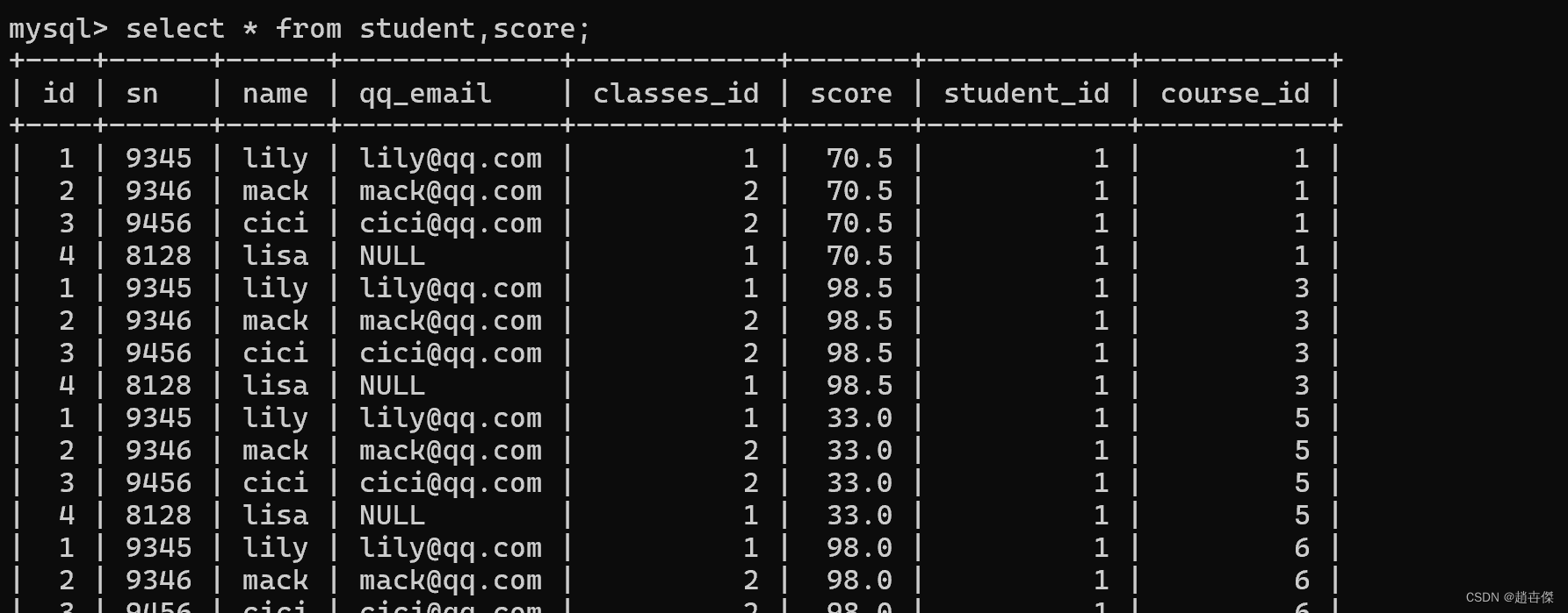 select * from student,class;相当于将两个表的数据进行了排列组合